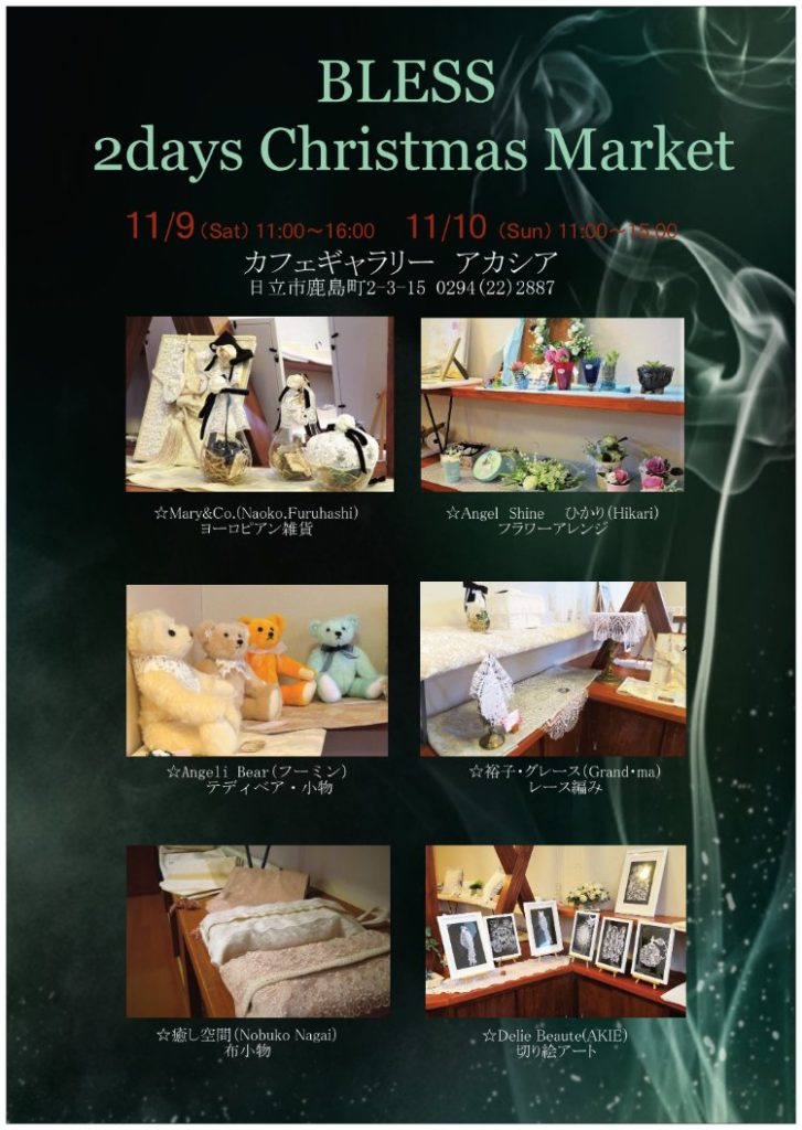 2019.11.9(土)~11.10(日) カフェギャラリーアカシアにて 『BLESS 2Days Christmas Market 2019』を開催致しました。 『Mary&Co.』 Naoko Furuhashi (ヨーロピアン雑貨) 『Angeli Bear』 フーミン (テディベア・小物) 『癒し空間』 Nobuko Nagai (布小物) 『Delie Beaute』 AKIE (切り絵アート) 『裕子・グレース』 Grand・ma (レース編み) 『Angel Shine』 ひかり(Hikari)(フラワーアレンジ)